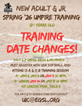 New adult and junior umpire (ages 12+) training. Must register with USA Softball and attend (1) A and 1(B) training session.