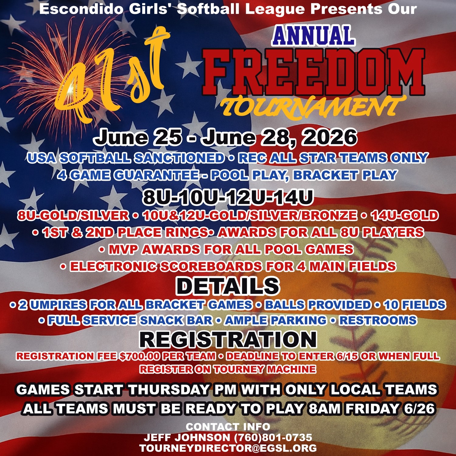 Escondido Girls Softball League is the proud host of two tournaments each year. The Veterans Classic is a North County Fall Ball tournament held in November for 12U and 14U teams and the Freedom Tournament is held in late June/early July for All-Stars teams ranging from 8U-14U. Come out and join us at Kit Carson Park to watch some amazing softball.